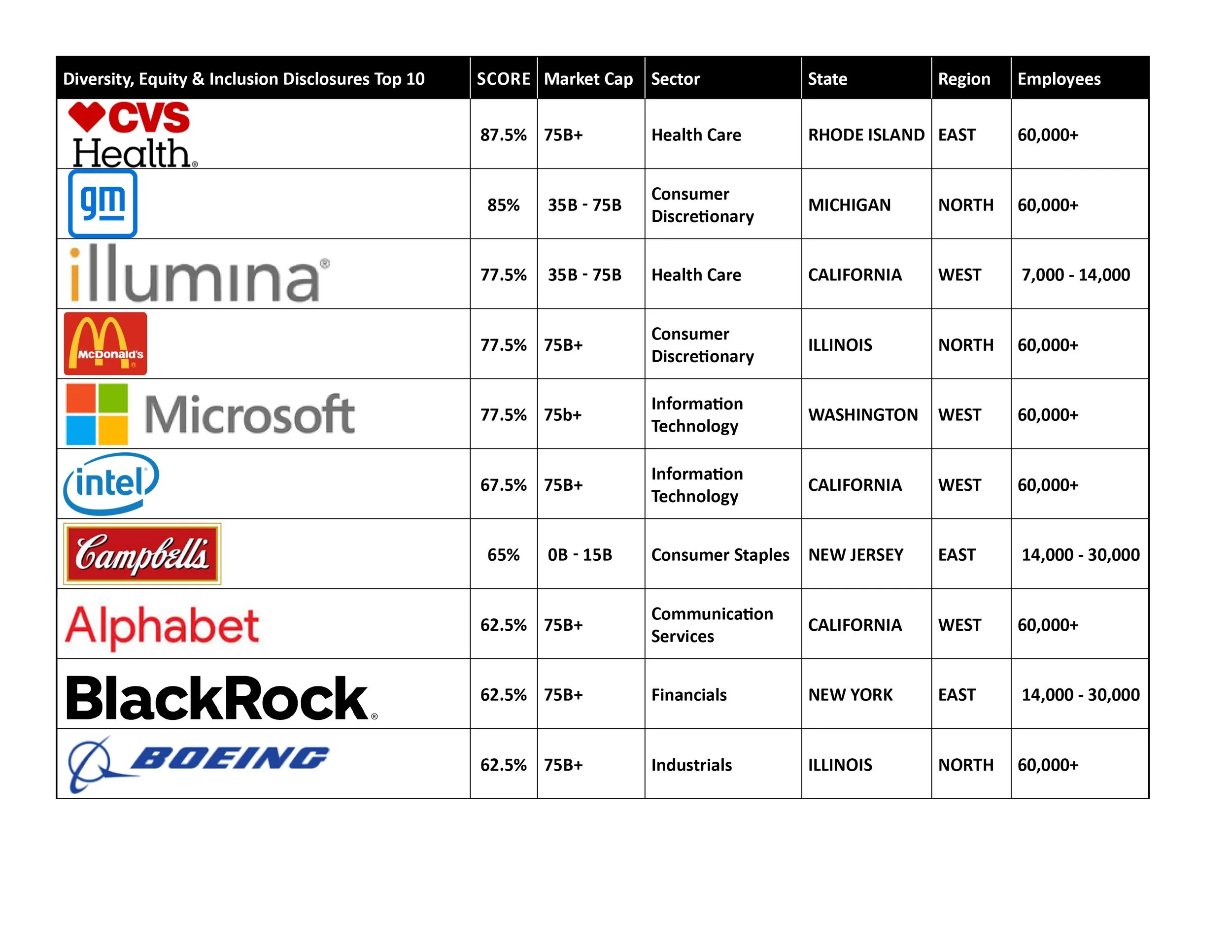 The largest Russell 1000 companies by market cap, and the largest employers by headcount, are most likely to release meaningful workplace diversity and inclusion data.