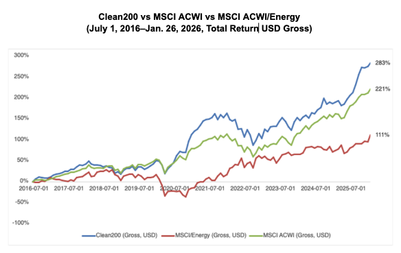 Measured on a sustainable revenue-weighted basis, the Clean200 has continued to deliver strong financial performance. As of January 26, 2026, the index generated a total return of 282.9% since its July 1, 2016 inception, compared with 111.0% for the MSCI ACWI/Energy Index of fossil fuel companies and 221.3% for the broader MSCI ACWI.
