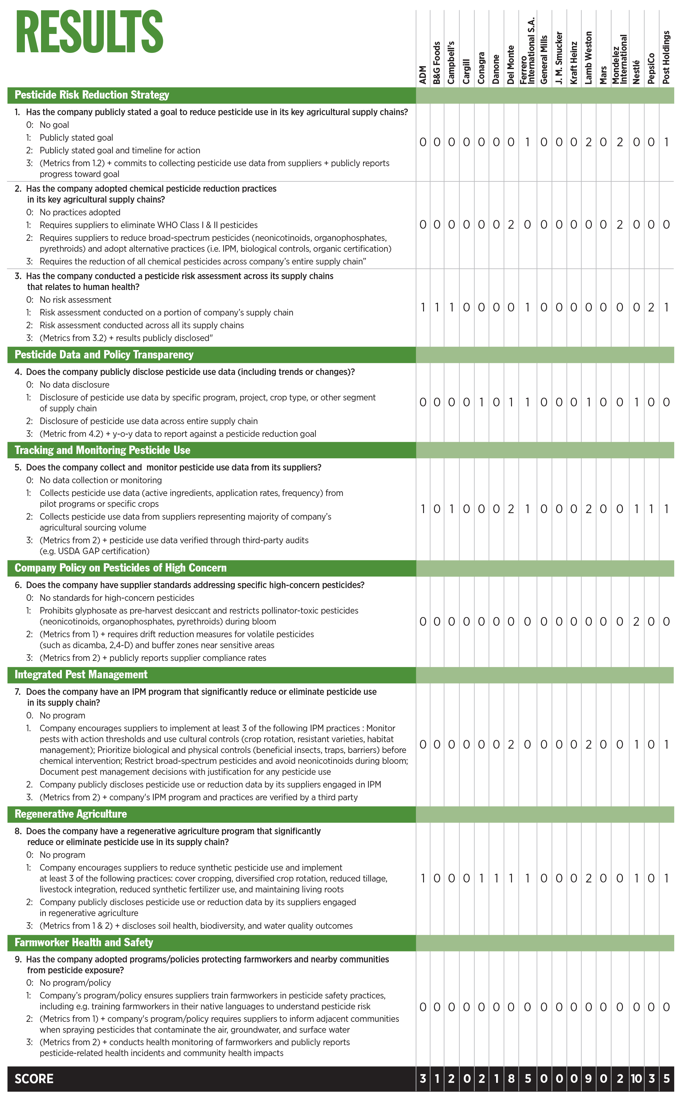 This scorecard benchmarks major food manufacturers and suppliers on their adoption of practices to measure and mitigate harm and risks related to the use of synthetic pesticides in agricultural supply chains. In scoring a set of questions related to pesticide-related company strategies and disclosures, the report provides a picture of the industry's overall performance, distinguishes leaders from laggards, and highlights notable practices.