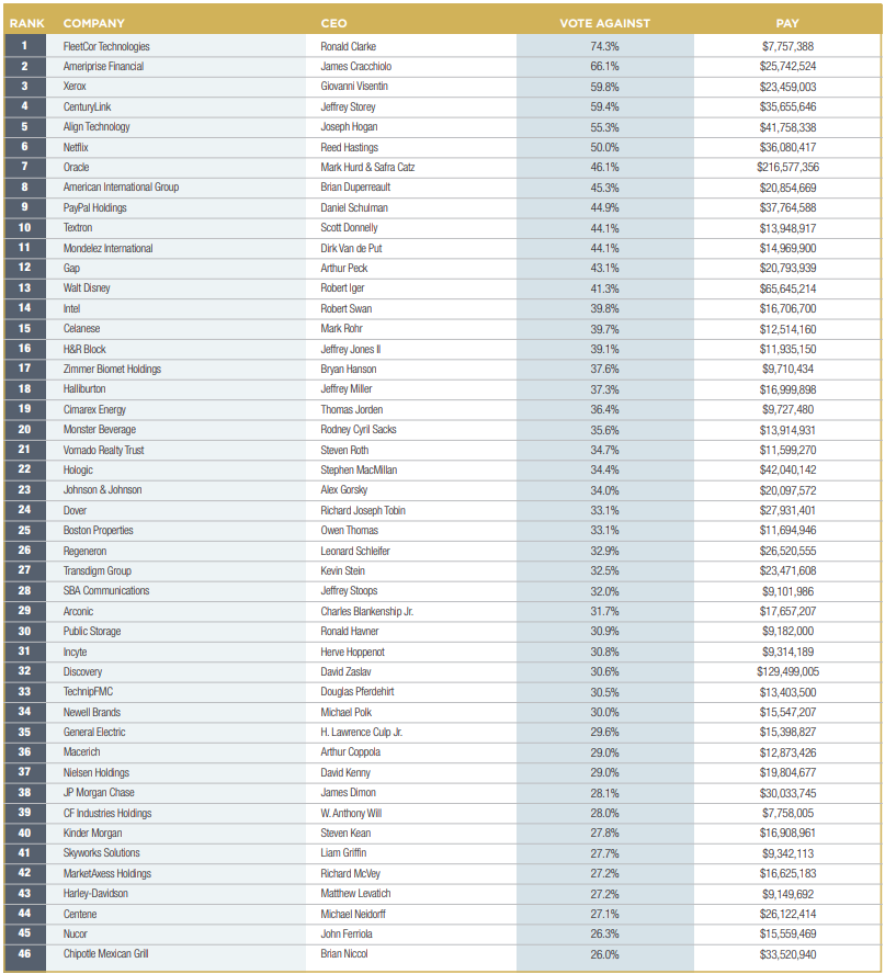 | RANK | COMPANY | CEO | CEO PAY | OVERPAYMENT | VOTES AGAINST CEO PAY | MEDIAN WORKER PAY | CEO:WORKER PAY RATIO |